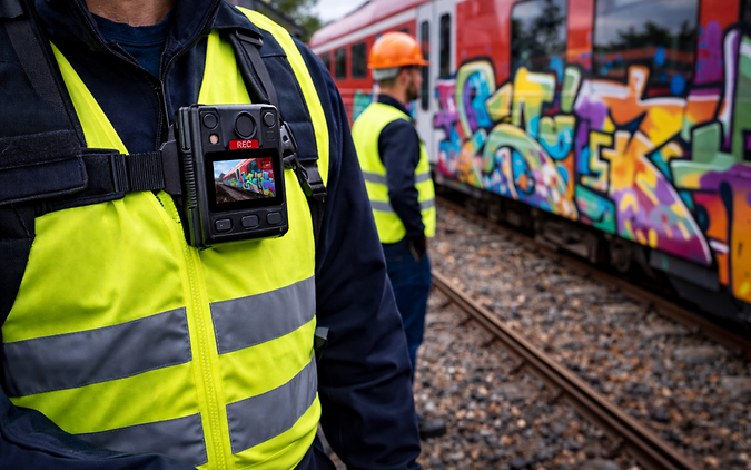 Bodycams worn by security personnel in parking lots record initial graffiti findings on vehicle exteriors, including vehicle number (UIC no.), parking location, and time, and transmits these results as one event/data packet via real-time communication tool between Bodycam and IDA (Intelligent digital assistant- DB tool). In IDA, the events/data packets are mapped with the findings from circulation and integrated into the existing data flow to the Corporate Security Cloud.
